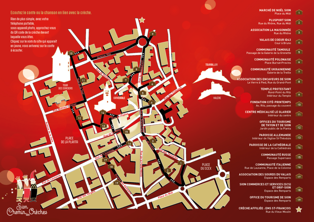 Seul, en famille ou entre amis, offrez-vous le temps de cette promenade qui débute à la Place des Princes… Comment ? Vous ne savez pas où elle se trouve ? Vous voyez… la ville de Sion n’a jamais fini de se dévoiler… Observez le plan, suivez les stèles, laissez les enfants vous guider et bon voyage !